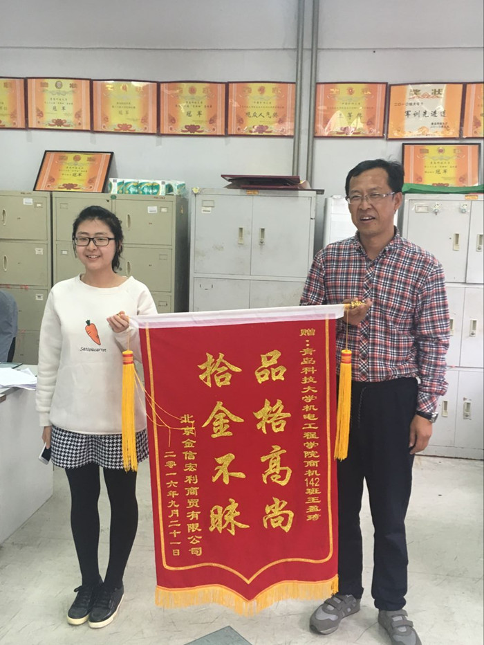 10月13日下午,3003新葡官方网站收到了北京金信宏利商贸有限公司李金菊赠送的一面锦旗,锦旗上写着“品格高尚,拾金不昧”。