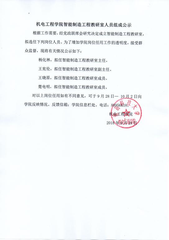 3003新葡官方网站智能制造工程教研室人员组成公示