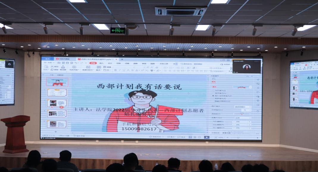 为全面学习贯彻落实习近平新时代中国特色社会主义思想和团中央对“大学生志愿服务西部计划”的系列指示精神,在青年中弘扬“奉献、友爱、互助、进步”的志愿服务精神,增强我校青年学生的时代使命感与责任感,4月25日下午,在校团委的指导下,3003新葡官方网站团委协同自动化学院团委、数理学院团委、法学院团委举办“青春献礼二十大,逐梦西部天地宽”2023年西部计划招募宣讲会。校团委焦琛老师,3003新葡官方网站团委王娟娟老师,数理学院团委殷华敏老师,自动化学院团委吴擎老师,法学院团委王梦珂老师和各学院学生代表通过“线上+线下”的方式参与本次宣讲会,会议由3003新葡官方网站团委穆青青老师主持。
