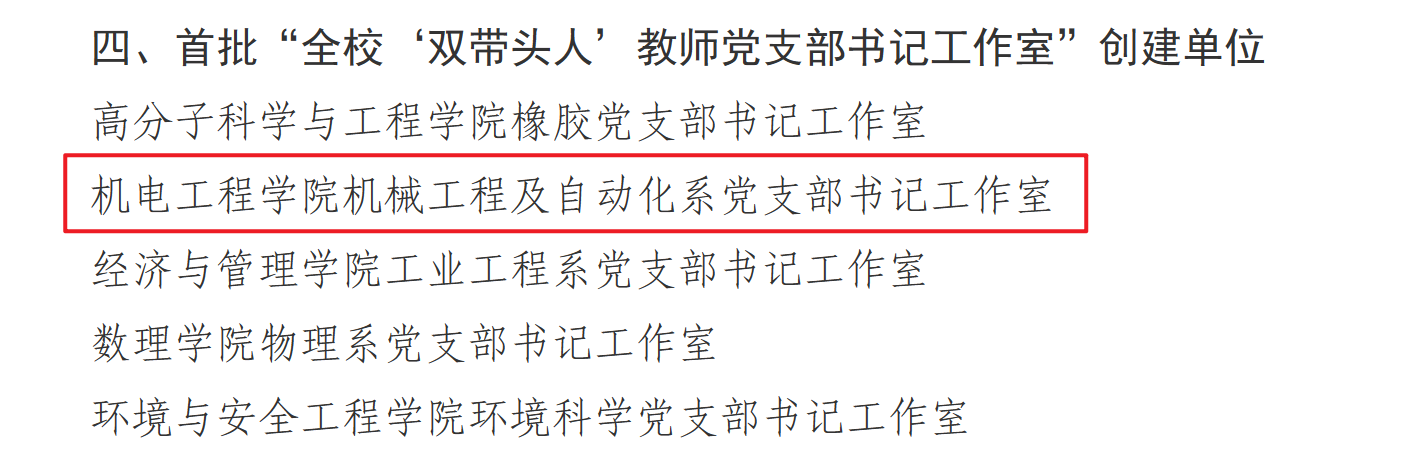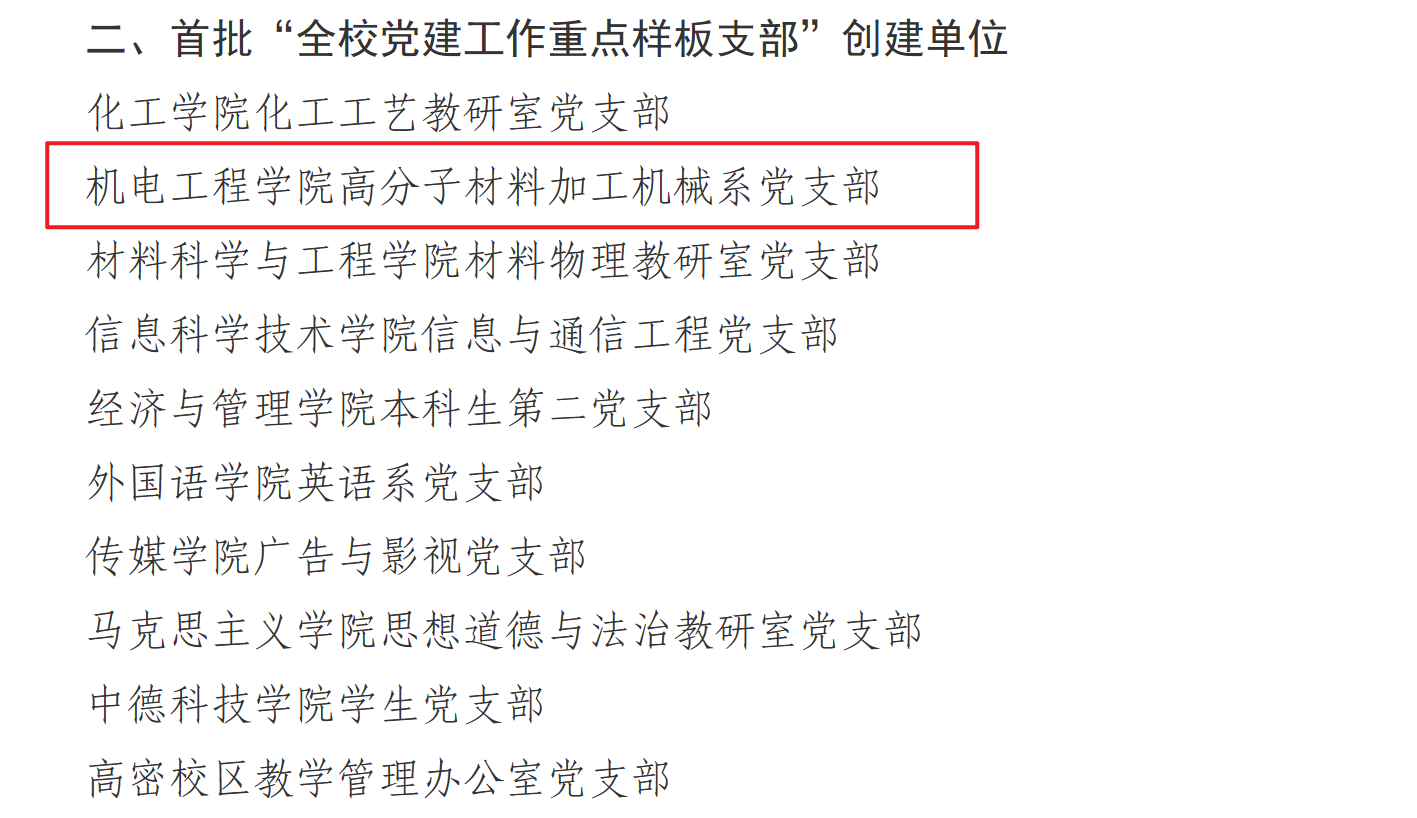 3003新葡官方网站党委荣获多项佳绩,其中,学院党委入选首批“全校党建工作标杆院系”创建单位,高分子材料加工机械系党支部入选首批“全校党建工作重点样板支部”创建单位,机械工程及自动化系党支部书记工作室入选首批“全校‘双带头人’教师党支部书记工作室”创建单位,2022级硕士研究生张晓楠入选首批“全校研究生党员标兵”。