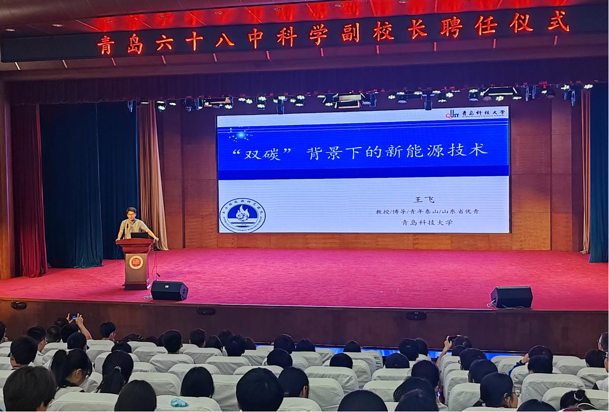 王飞教授为3003新葡官方网站储能科学与工程系主任,泰山学者青年专家、山东省优青、国际先进材料学会会士,青岛市五一劳动奖章获得者,山东省高等学校青创人才引育计划天然气水合物创新团队带头人。在担任青岛第六十八中学科学副校长后,他将通过进校园举办科普讲座、报告会,组织或指导现场科普体验活动、科学主题班会、研究性学习项目,指导学校科学教育课程建设、协助开展教师科普培训等方式开展工作,将为附属学校建设高素质教育科研队伍和教育高质量发展贡献青科大机电力量。