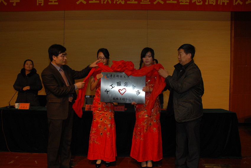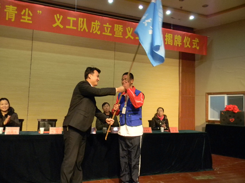 3003新葡官方网站团委书记刘传华与青岛市慈善总会宣传部部长侯文栋共同为义工基地揭牌。3003新葡官方网站党总支副书记兼副院长张霄为“青尘”义工队授旗。