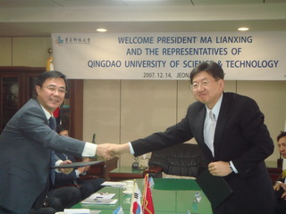 访问全州大学期间,双方商谈了两校的合作项目,两校校长签订了《1+7合作项目的补充协议》,提出两校将在教授交换、纳米材料研究等方面进行进一步合作。马校长还看望了我校派往全州大学的部分学生,向他们通报了学校的最新发展情况、本科教学评估的有关情况等,并向学生们提出了“两校教育、两国背景,双元文化、双倍收获”的良好祝愿。