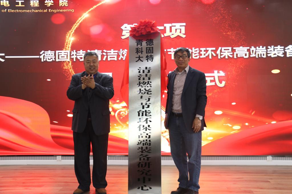 张元利书记与魏振文董事长为青科大-----德固特清洁燃烧与节能环保高端装备研究中心揭牌。
