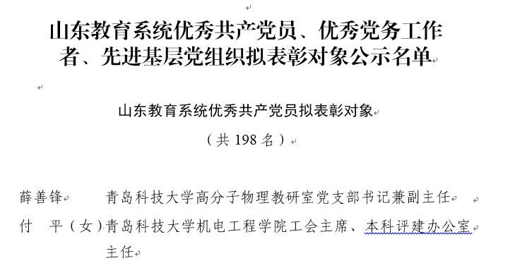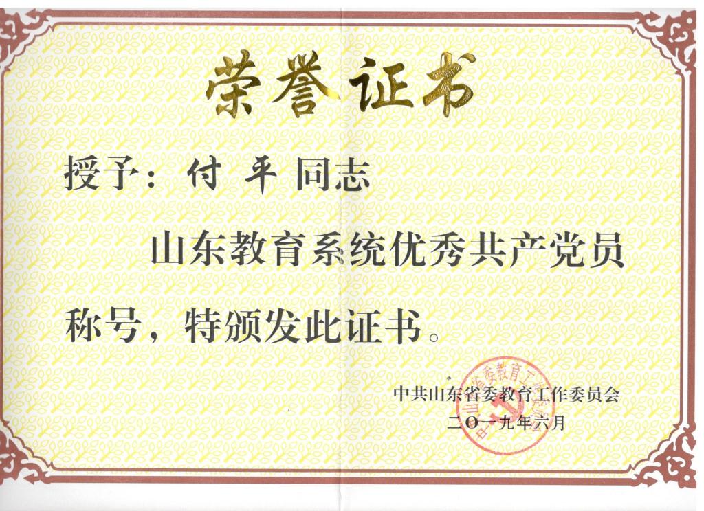 近日,在山东省教育厅公布的山东省教育系统优秀共产党员、优秀党务工作者、先进基层党组织名单中,我院付平老师名列其中。