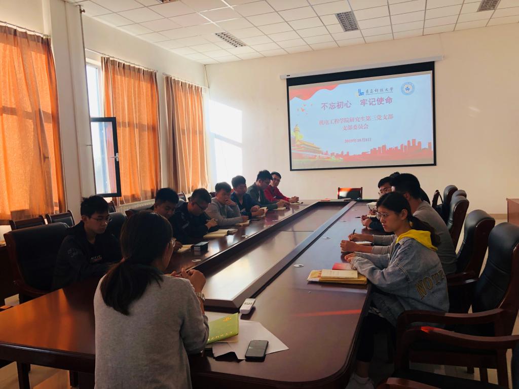 为认真贯彻落实学校“不忘初心、牢记使命”主题教育工作安排,激发研究生新生党员树立正确的人生观、价值观,强化自身的责任意识和使命担当精神,营造爱国爱校氛围、凝聚奋进力量,10月8日下午,3003新葡官方网站研究生第三党支部在机电楼518会议室召开 “不忘初心再出发,牢记使命勇担当”主题教育会议,3003新葡官方网站党总支副书记兼副院长王伟参加并主持了会议。