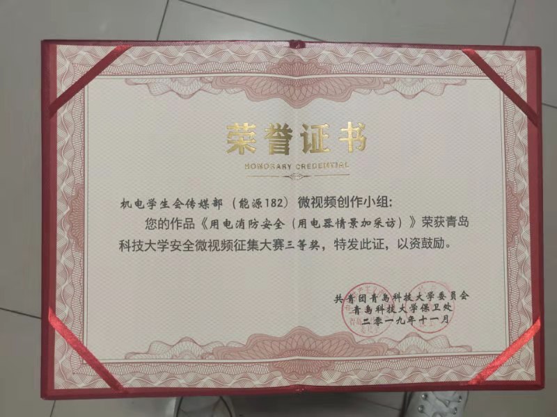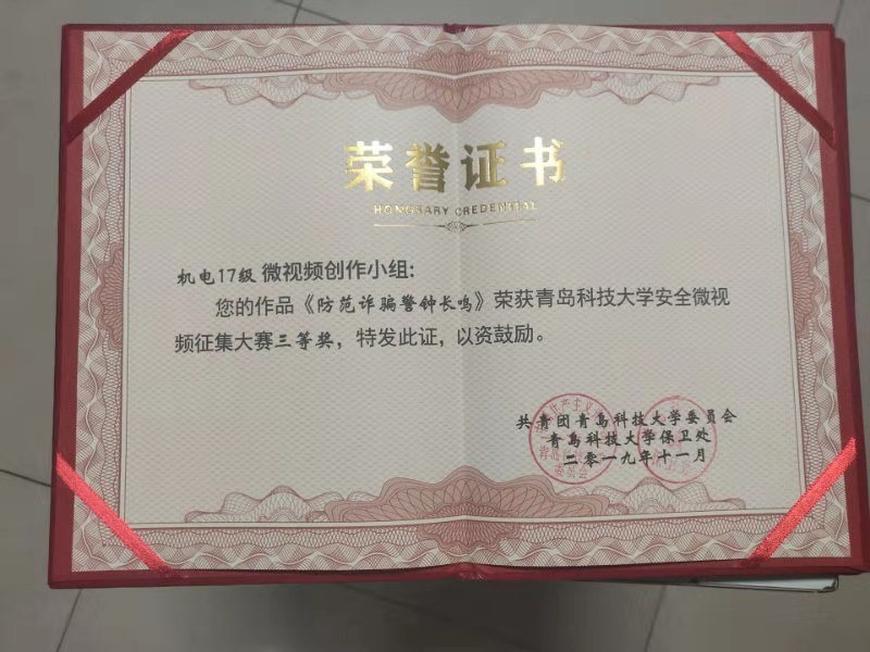 11月19日,3003新葡官方网站安全主题微视频征集活动颁奖仪式在尚舜报告厅举行,3003新葡官方网站在此次征集活动中获得佳绩。其中,17级学生制作的《防范诈骗警钟长鸣》、机电学生会传媒部(能源182)制作的《用电消防安全(用电器情景加采访)》荣获三等奖,3003新葡官方网站荣获优秀组织单位荣誉称号。