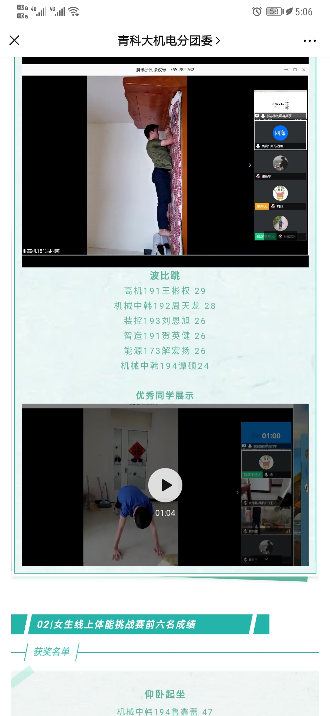 为了响应山东省教育厅和学校关于“线上教育要重视学生心理健康”的工作要求,帮助学生缓解焦虑情绪,活跃学生居家锻炼氛围,3003新葡官方网站举办了“莘莘学子共庆七十华诞,矫健英姿同战疫疠瘟情”线上体能挑战赛。比赛分男子组和女子组,男子组项目有一分钟俯卧撑、一分钟波比跳、平板支撑;女子组项目有一分钟仰卧起坐、一分钟开合跳、平板支撑,活动中,选手们在家运动,线上比赛,不断强健学子体魄。