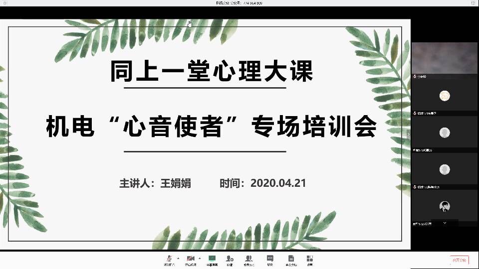 为进一步完善学校、学院、班级、宿舍“四级”工作体系建设,提高朋辈助人、自助能力,提升学生获得感、幸福感、安全感,增强大学生心理健康素质,4月21日下午,针对18级、17级和16级开展了“同上一堂心理大课”----机电心音使者专场培训会。通过腾讯会议平台,共有520名心音使者参与培训,培训由3003新葡官方网站心理工作站王娟娟老师和曲智强老师分别主讲。