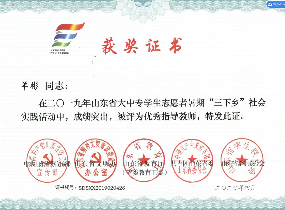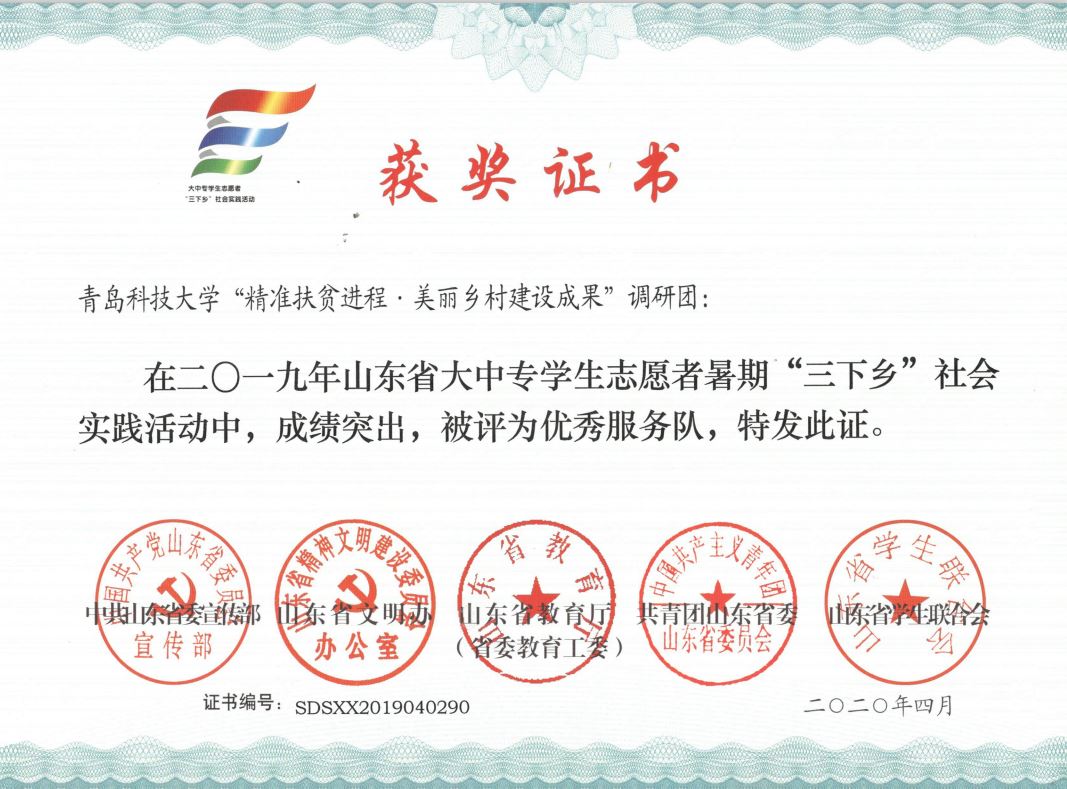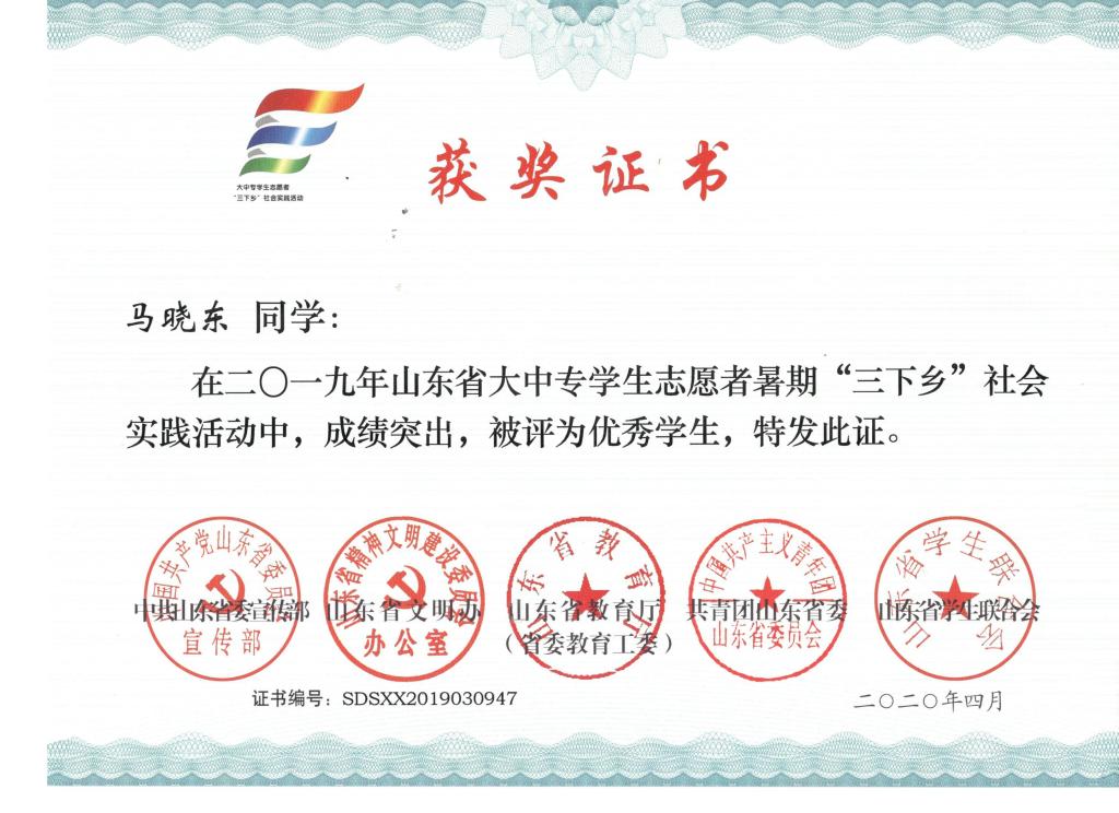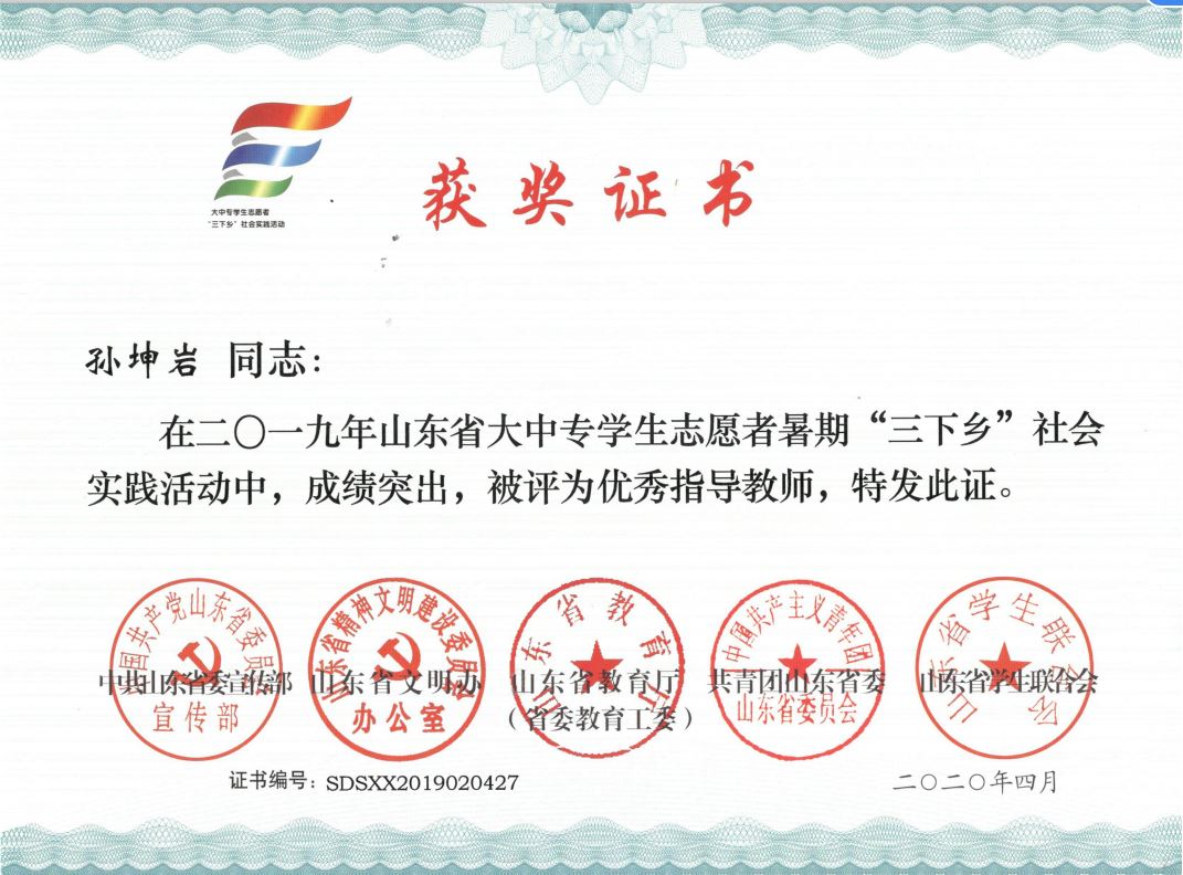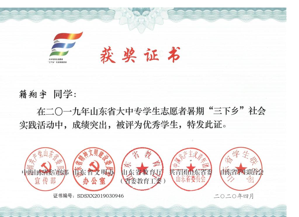 近日,2019年山东省大中专学生志愿者暑期文化科技卫生“三下乡”社会实践活动先进集体和先进个人的证书下发,3003新葡官方网站“3003新葡官方网站精准扶贫进程 美丽乡村建设成果”调研团、获“三下乡”省级优秀服务团队,孙坤岩、羊彬获“三下乡”社会实践活动优秀指导教师,籍翔宇、张晓楠、范浩然、马晓东获 “三下乡”社会实践优秀学生。