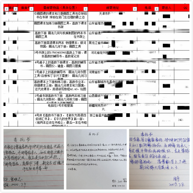 此次活动由辅导员带头,并在辅导员具体指导下完成,前期经过细致统计、筛选,确定需要邮寄物品的学生名单、所在宿舍号、需邮寄物品以及邮寄地址等,每名学生写委托书拍照交给辅导员,辅导员核对需要邮寄的物品后,带领学生干部、入党积极分子以及热心同学到学生宿舍与学生通过视频连线、电话等方式再次确定需要邮寄的物品,对于笔记本电脑等贵重物品,反复同快递小哥沟通,对物品进行细致包装、保值和加急,确保贵重物品能够以最快的速度完好无损地寄送到学生手中。