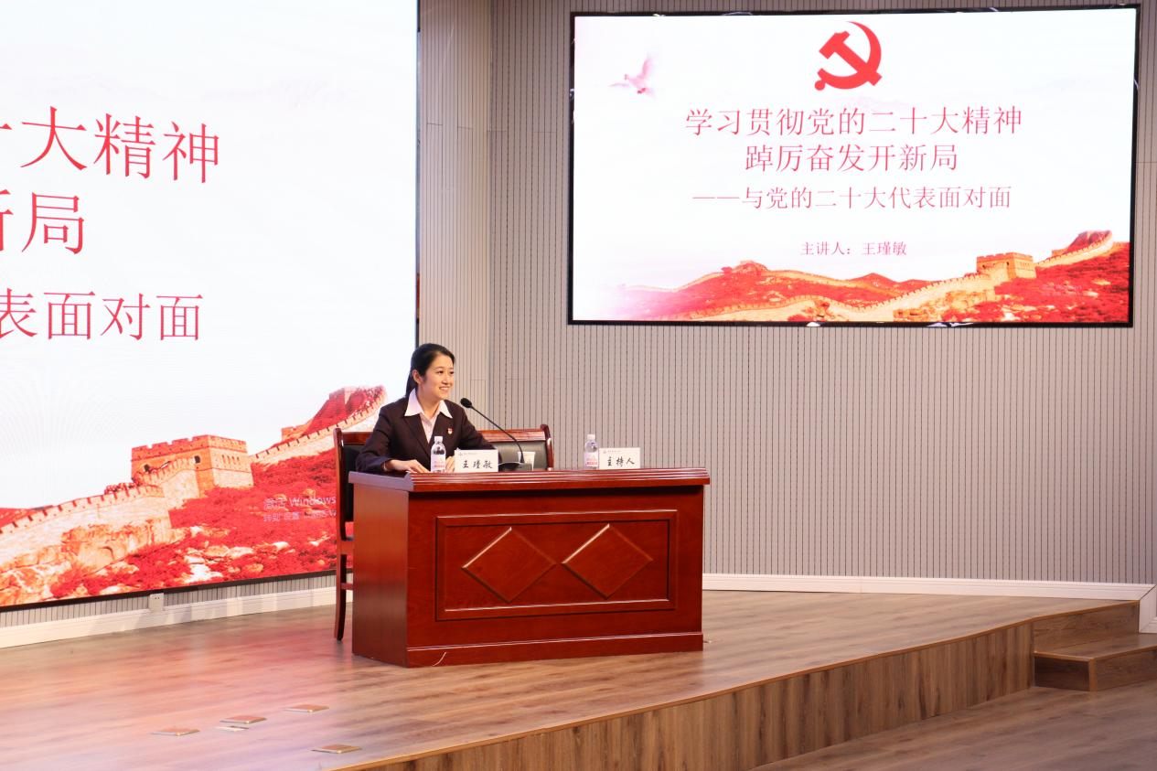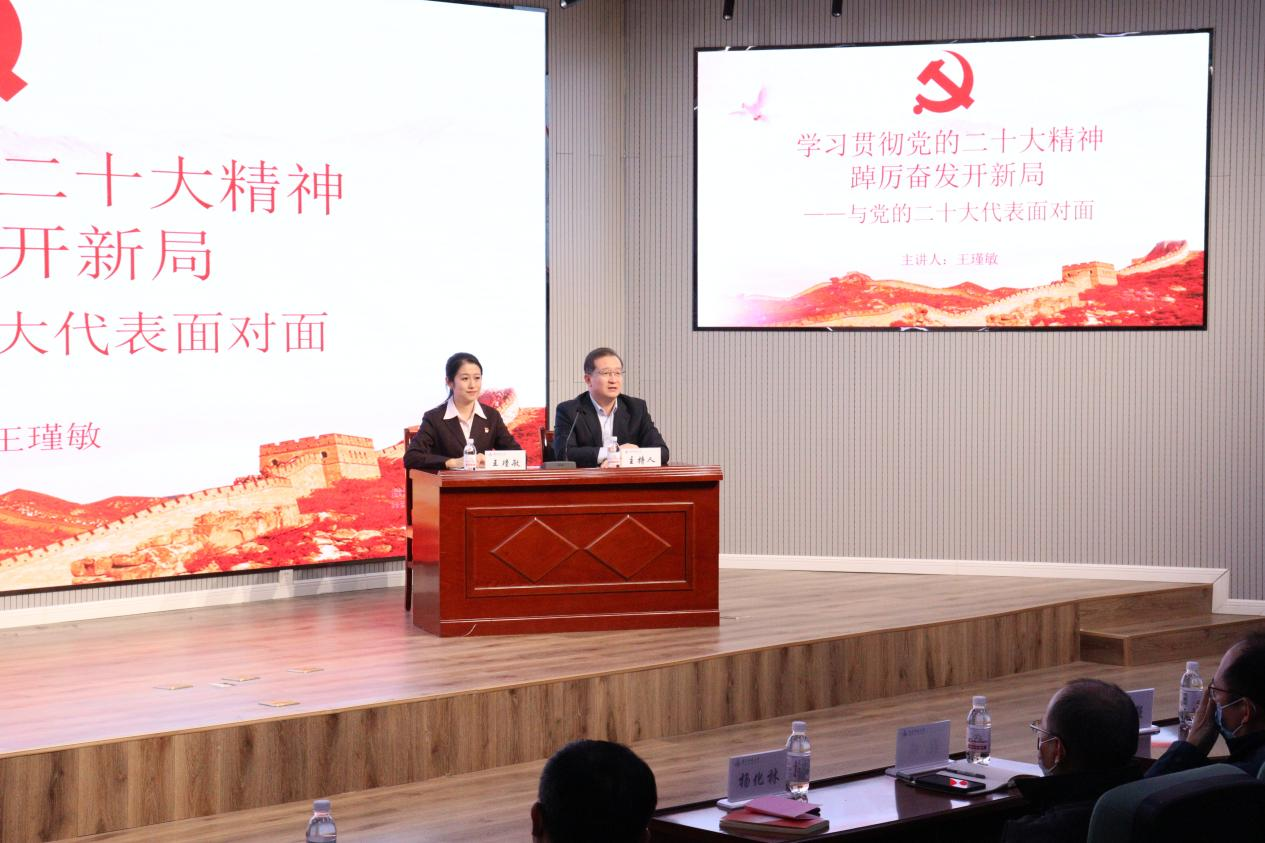 党的二十大代表王瑾敏以《让青春在火热实践中绽放绚丽之花》为题作党的二十大精神宣讲。她从自身参加党的二十大的经历感受出发,用真切的情感、鲜活的事例、生动的语言回顾了党的二十大盛况、系统阐释了党的二十大精神内涵,分享参加党的二十大的所见所感所思所悟,展示了奋斗在基层一线、在平凡岗位上铸就不平凡业绩的二十大代表的闪光形象。宣讲主题鲜明、内涵丰富、思想深刻、鼓舞人心,为3003新葡官方网站干部师生带来了丰厚的理论滋养。作为亲身经历党的二十大盛会的代表,王瑾敏结合自身实际,勉励学院师生要学深悟透报告精神、身体力行做好贯彻落实,并以青年人的视角鼓励学院师生要坚定理想信念,敢想敢为,善作善成。