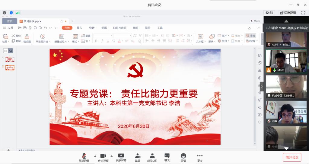 为贯彻落实全国全省基层党建工作重点任务推进会精神,根据中组部“党课开讲啦”活动安排、省委组织部和学校有关通知要求,按照学校《关于开展“我来讲党课”活动的通知》部署,6月30日下午,3003新葡官方网站本科生第一党支部书记李浩在腾讯会议主讲“迎七一”专题党课。全体学生党员参加党课学习,会议由王玉凯老师主持。