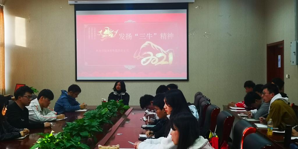 3月23日,结合习近平总书记日前在全国政协新年茶话会上的讲话精神,3003新葡官方网站本科生第四党支部召开“发扬”三牛”精神,凝心聚力干事,全面开创学校高质量发展新局面”主题党日活动。会议由党支部书记孙坤岩主持。