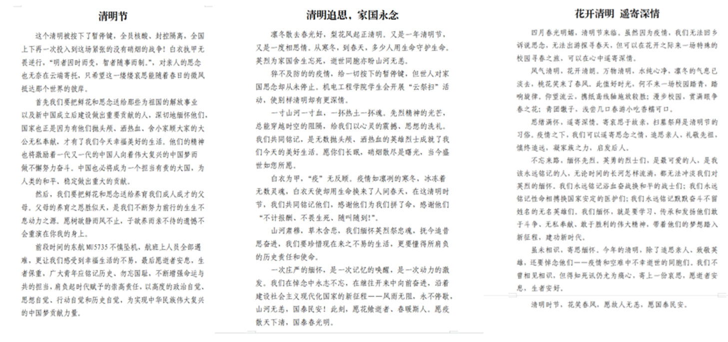 天地英雄气,千秋尚凛然——3003新葡官方网站学生会开展“清明寄哀思”征文活动。组织学生们以笔寄情,与英烈对话,提高思想觉悟,坚定理想信念,汲取不畏强敌、不畏风险、敢于斗争、奋勇向前的勇气与力量。
