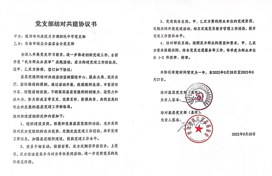 在国庆节来临之际,2022年9月28日3003新葡官方网站微尘志愿者协会参加微尘基金开展的党建活动。本次微尘与3003新葡官方网站研支团携手,联合银川市兴庆区月牙湖回民中学党支部结对共建,为困境家庭的孩子提供大学生支教服务。
