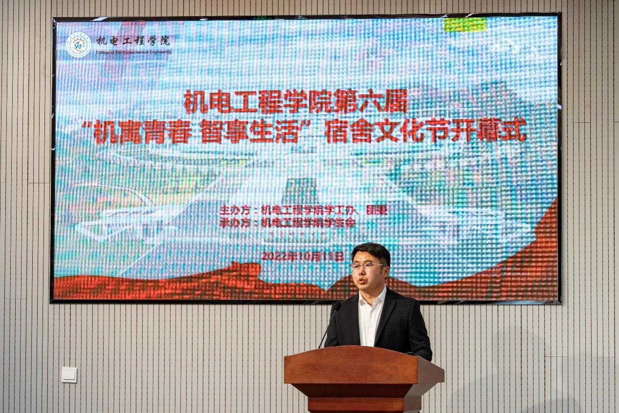 肖强书记代表学院对本次宿舍文化节开幕式的举办表示热烈祝贺,肖强书记表示,宿舍是大学生生活的主要场所,同学们需要共同努力,维护好宿舍的环境,营造温馨的氛围,希望同学们以宿舍文化节为契机,抓好机会、积极作为,精诚团结、共同努力,树立“积极向上、文明健康”的生活态度、以“舍风、学风”建设为中心、以“团结,互助”为力量,从小事做起、从点滴做起,从打造优秀的宿舍文化做起,积极参加到高质量宿舍建设中,为打造具有机电特色的学习型、文明型、创新型、和谐型宿舍而努力,积极地促进校园文明建设,向党的二十大展现新时代青年的生机与活力。