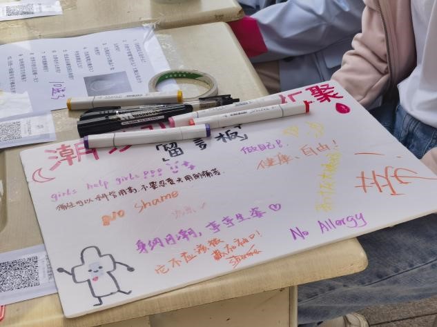 活动一开始就引起了路过同学的广泛关注,周围围满了等待参与活动的同学。在现场微尘志愿者协会会员的有序组织下,同学们进行了有关月经问题10选3的科普回答活动,参与抽奖领、领取奖品,同时写下了自己的爱心留言。