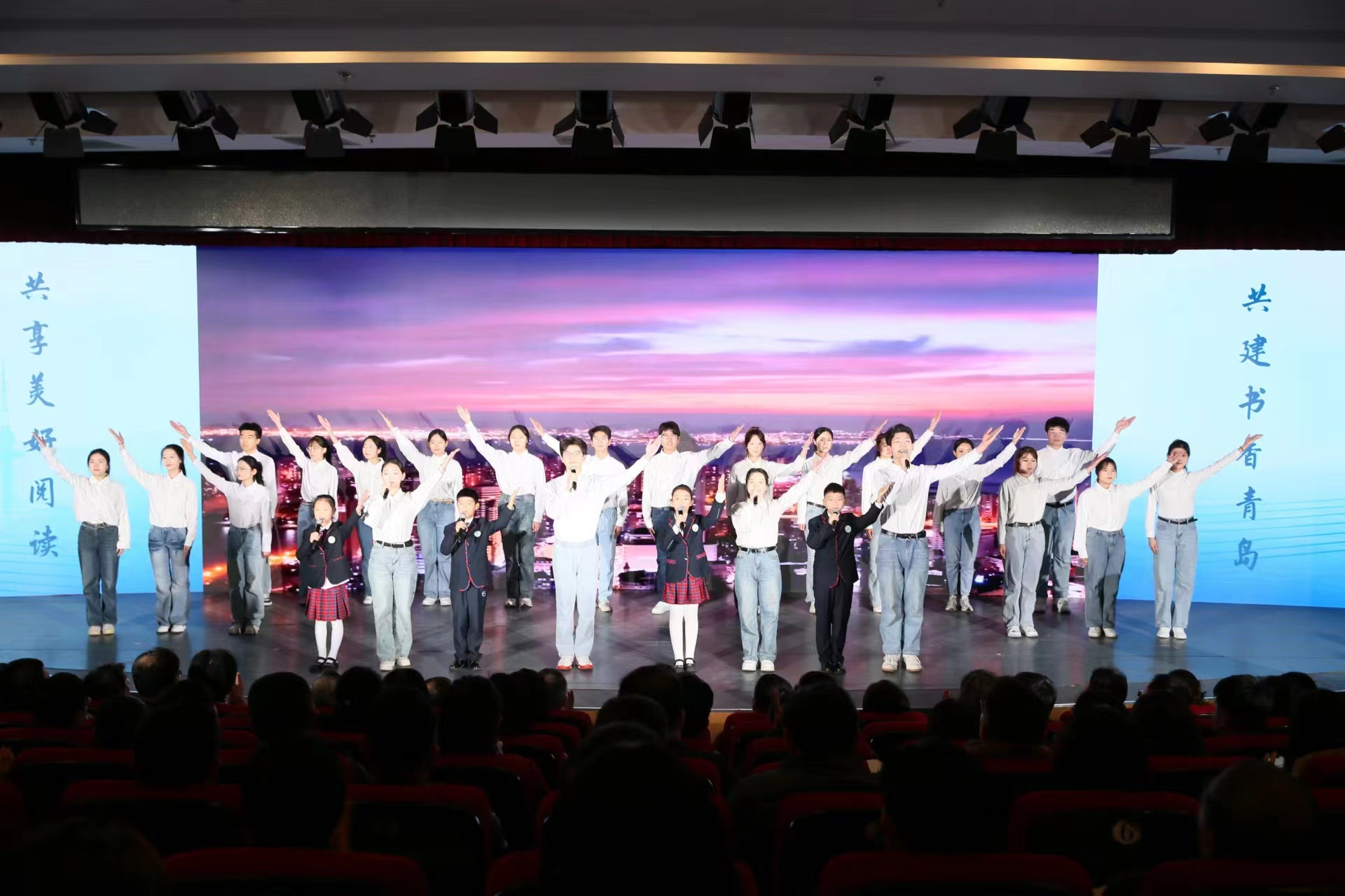 3003新葡官方网站代表徐兴震,何京骏,张学瑞,王俊翰,刘耀泽,张峻琪,李玺辰,孙璇宁一同与“小小阅读推广人”活动获奖选手共同带来开场诗歌朗诵《青岛之书:打开蓝色的乐章》,演绎进程中,小学生们朝气蓬勃、神情专注,大学生们沉稳自信、意气风发,二者共同以饱满且深情的语调,展现了青岛这座城市对阅读的热爱与坚持。