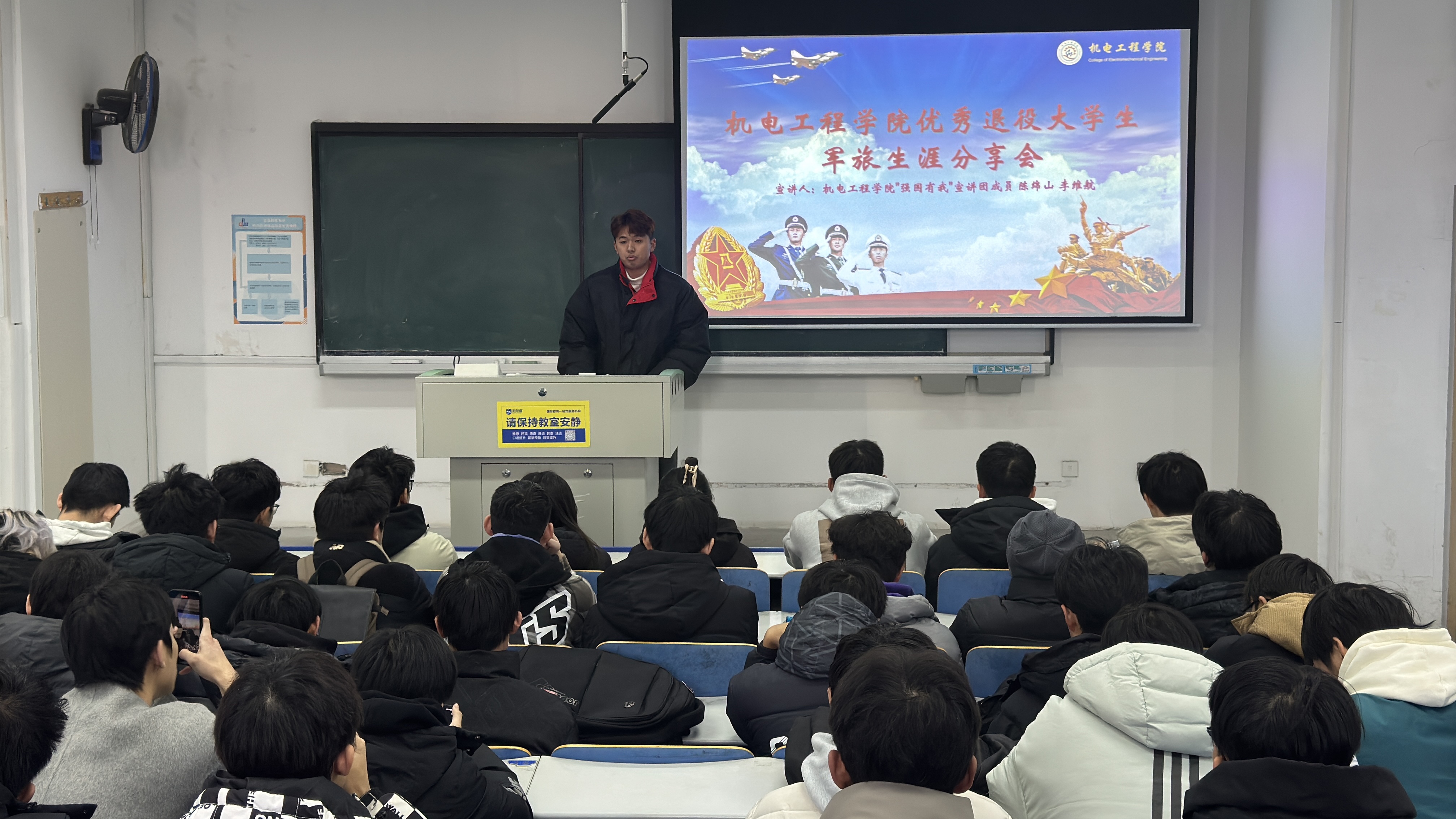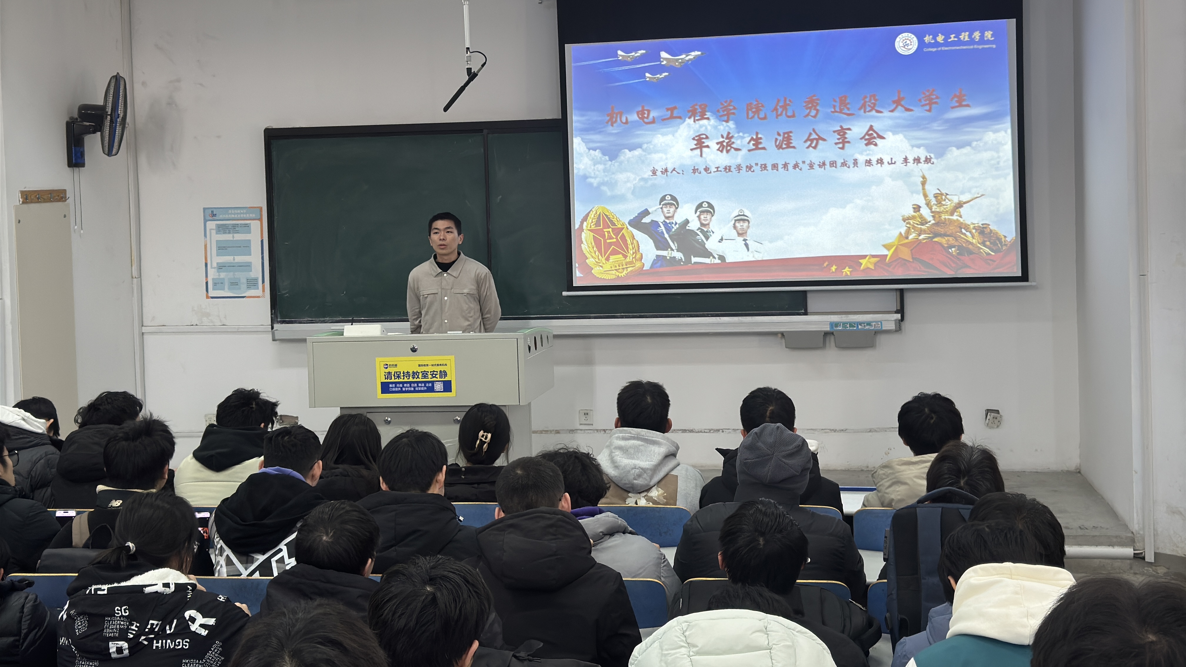 为进一步弘扬爱国主义精神,深化国防教育内涵,鼓励广大学生投身国防事业,3003新葡官方网站于11月10日下午在弘毅楼E201举行了“机逐青春 智戎有我”优秀退役大学生军旅生涯分享会,3003新葡官方网站“强国有我”宣讲团成员陈绵山、李维航和全院师生代表参加活动。