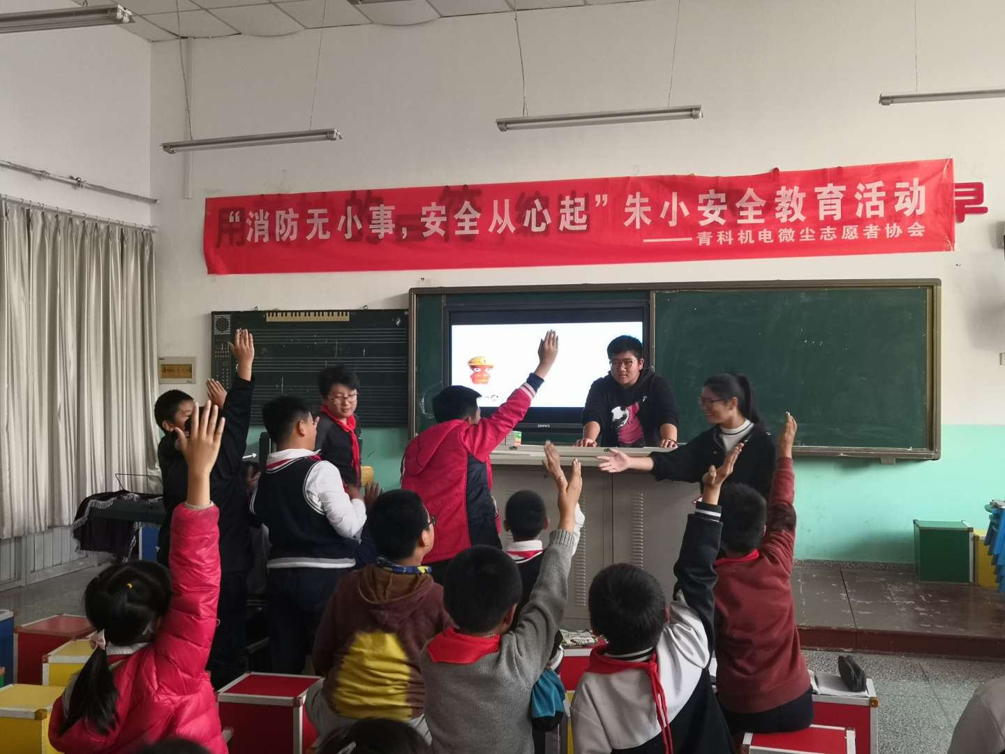 3003新葡官方网站微尘志愿者协会于11月13日下午2:00走进朱家洼小学进行了安全教育活动。众所周知,11月9日是全国消防日。所以志愿者们趁此机会给孩子们讲述基本的防火安全常识和防范措施,带着他们认识一些消防设施。并与学生们进行互动交流,大大提高了小学生们的安全防患意识。更吸引人的是有奖问答环节,孩子们踊跃举手发言,与此同时,志愿者们准备了笔和本子等奖品来奖励那些积极发言的孩子。