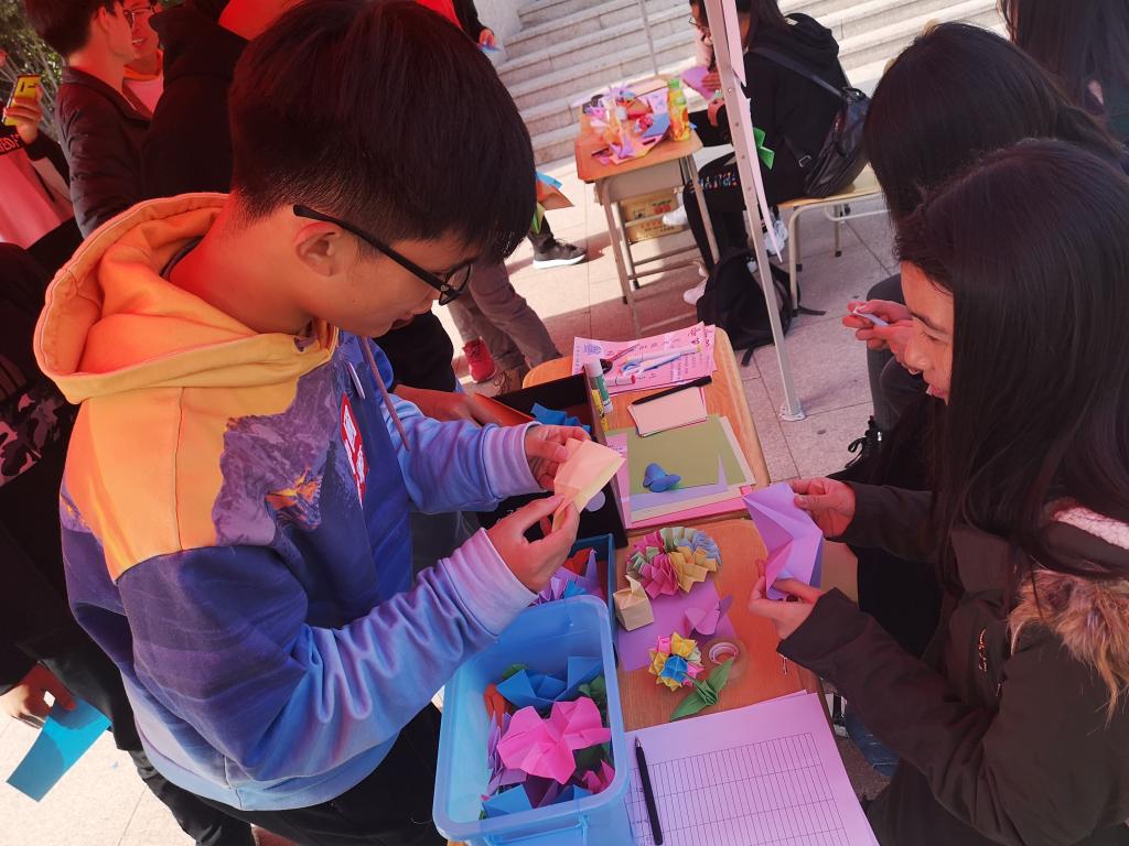 寒冷的天气阻挡不了同学们参加公益活动的热情,在志愿者们热心的引导下,登记、取纸、折纸、留下寄语、拍照留念。暖阳下,一件又一件精致的作品在同学们的手中诞生。折纸义捐活动正如火如荼地展开着,成为冬日校园中一道亮丽的风景线。