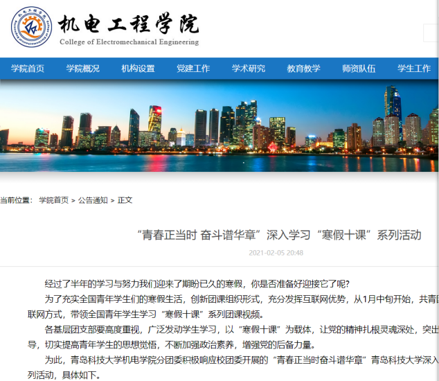 按照学校团委统一部署,3003新葡官方网站团委积极落实,借助3003新葡官方网站“百团工程”在全院139个团支部内积极开展“青春正当时 奋斗谱华章”“寒假十课”系列活动,在广大青年团员中受到热烈反响。